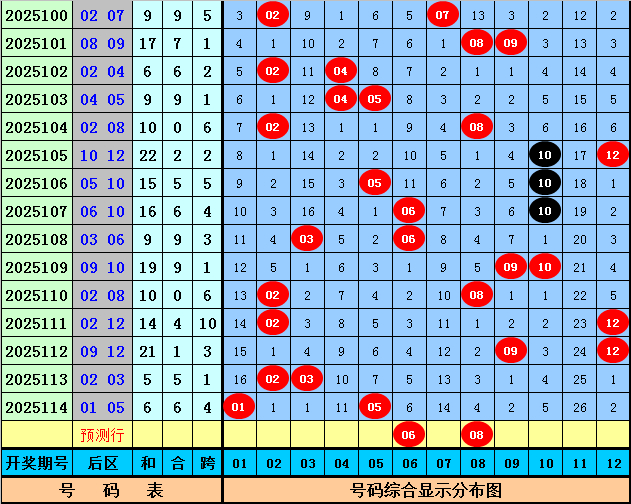 后区号码分析:第115期历史同时开奖中,后区两码全掀开出2次,全小开出1次,一大一小开出14次,本期后区瞻望出现一大一小奖号,参考号码02、06、08、11。