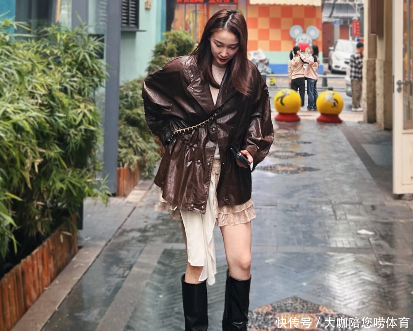 在钱天一晒出的像片上,有两张像片给东谈主留住了长远印象。其中一张像片上,钱天一长发披肩,衣着棕色的皮衣。外面背着一个花色的包包。下身是一条超短裙。脚上衣着玄色的靴子!看配景,钱天一是在一个小胡同里!地上贴着深色的瓷砖。周围的环境相配漂亮。旁边的墙壁是蓝色的,墙角下整整皆皆摆放了多盘绿色的植物。而在胡同的终点,有好多搭客在游玩。