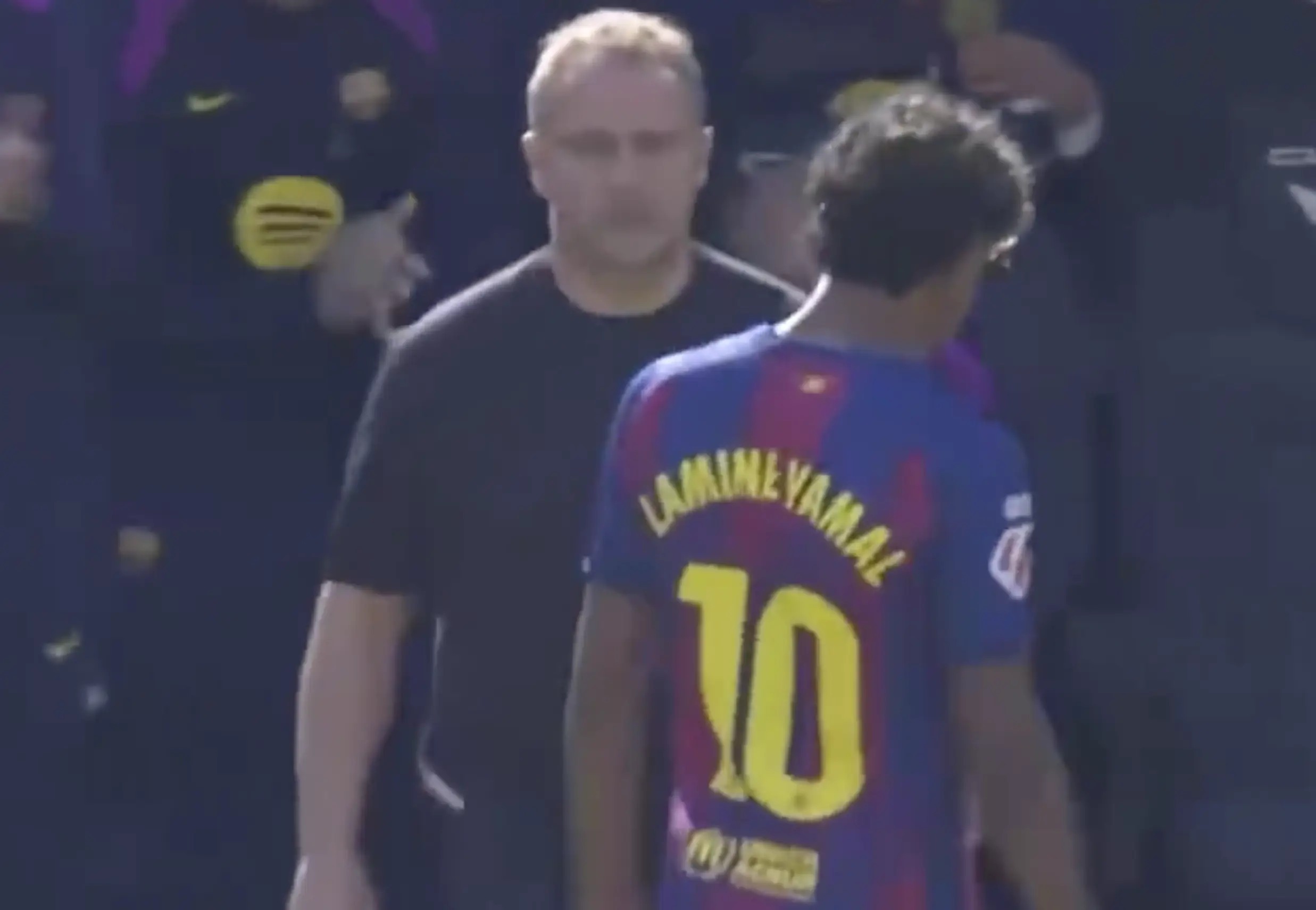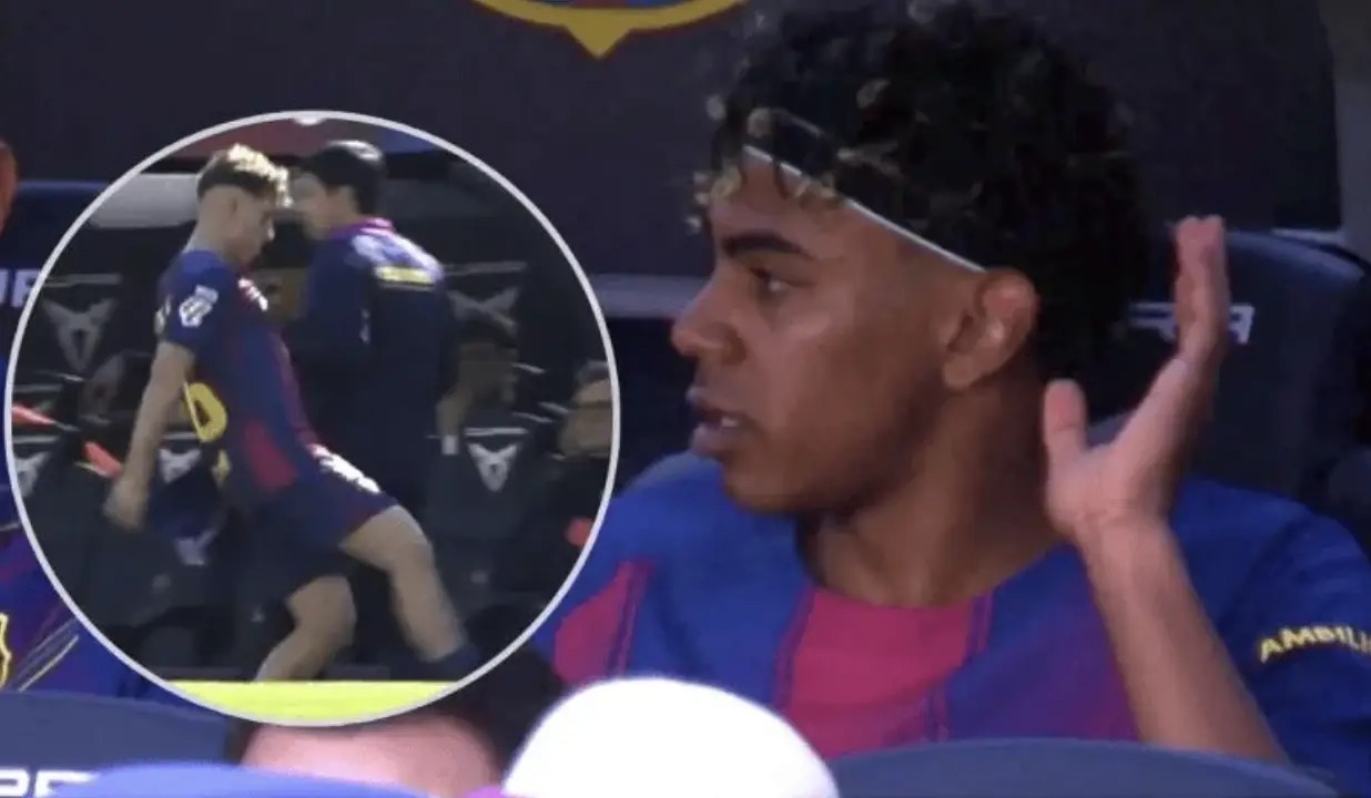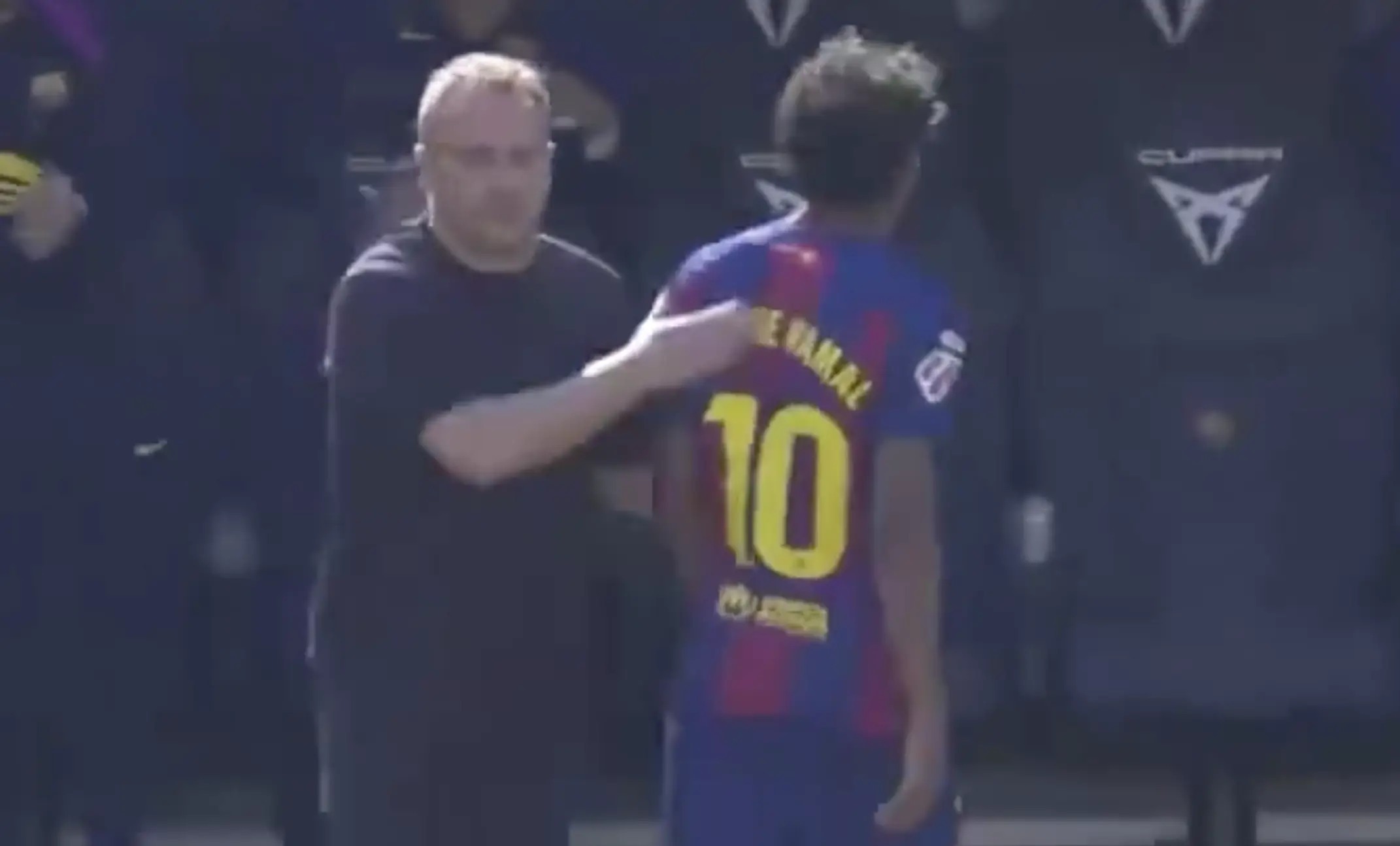 尽管与弗里克进行了击掌,但亚马尔在走向替补席的历程中4次指向弗里克,抒发对我方被换下的质疑。到了替补席上,亚马尔向着助教阿尔瑙-布兰科放浪悔怨:“每次皆是我,险些疯了,太离谱。”